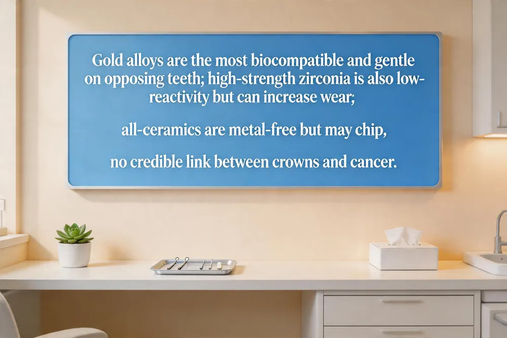 When choosing a crown, biocompatibility and long‑term health are top priorities. Gold alloy crowns are widely regarded as the healthiest option because the inert metal causes minimal wear on opposing teeth, is chemically stable, and can last decades even in high‑stress molar sites. High‑strength zirconia follows closely, offering excellent fracture resistance, tooth‑colored aesthetics, and a low‑reactivity profile, though its hardness can increase wear on the opposite bite. All‑ceramic materials such as lithium‑disilicate (E‑max) and porcelain are also metal‑free and well‑tolerated, but they are more prone to chipping under heavy chewing forces. Porcelain‑fused‑to‑metal (PFM) crowns combine strength and appearance but may release metal ions that trigger sensitivities in some patients. Regarding cancer risk, current scientific evidence shows no credible link between dental crowns and cancer. All FDA‑approved crown materials—porcelain, ceramic, zirconia, gold, and other metal alloys—are rigorously tested for biocompatibility and contain no known carcinogens. Proper oral hygiene and regular dental check‑ups remain essential for overall oral health, but the crowns themselves do not increase cancer risk.