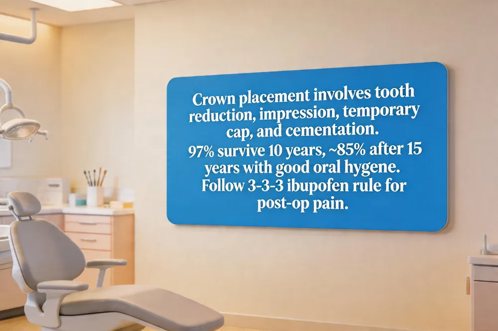 Placing a dental crown starts with an exam, X‑rays, and local anesthesia. Decay is removed and the tooth reshaped, trimming an amount of enamel. An impression or scan is taken and sent to a lab—or milled chairside with CAD/CAM—while a temporary cap protects the tooth. When the crown is ready, the temporary is removed, the new crown is tried in, adjusted for fit and bite, then cemented. A ‘tooth cap’ is a provisional restoration or partial onlay that protects the tooth temporarily, while a crown fully encircles it. The 3‑3‑3 rule for post‑op pain advises 200 mg ibuprofen three times daily, every three hours, for up to three days. Studies show about 97 % of crowns work after ten years, with roughly 85 % still good after fifteen years when hygiene is maintained.