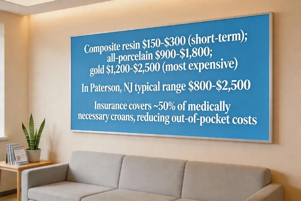 Dental crown pricing varies widely by material, location, and insurance coverage. The most affordable option is a composite resin crown, typically $150‑$300 per tooth, used for short‑term protection. Gold crowns are the most expensive, ranging $1,200‑$2,500, while all‑porcelain crowns fall between $900‑$1,800. In Paterson, NJ, crowns generally cost $800‑$2,500 depending on material—PFM crowns $800‑$1,400, all‑ceramic or zirconia $1,000‑$2,000, and gold or full‑metal $900‑$2,500. Dental insurance usually covers about 50 % of medically necessary crowns, reducing out‑of‑pocket expenses after benefits. Common crown types and their approximate costs are: all‑metal $800‑$1,200, gold alloy $1,200‑$2,500, PFM $900‑$1,500, all‑ceramic (zirconia or lithium disilicate) $1,100‑$2,000, and temporary composite $150‑$300. Additional fees for exams, X‑rays, or core buildup may add $100‑$300.