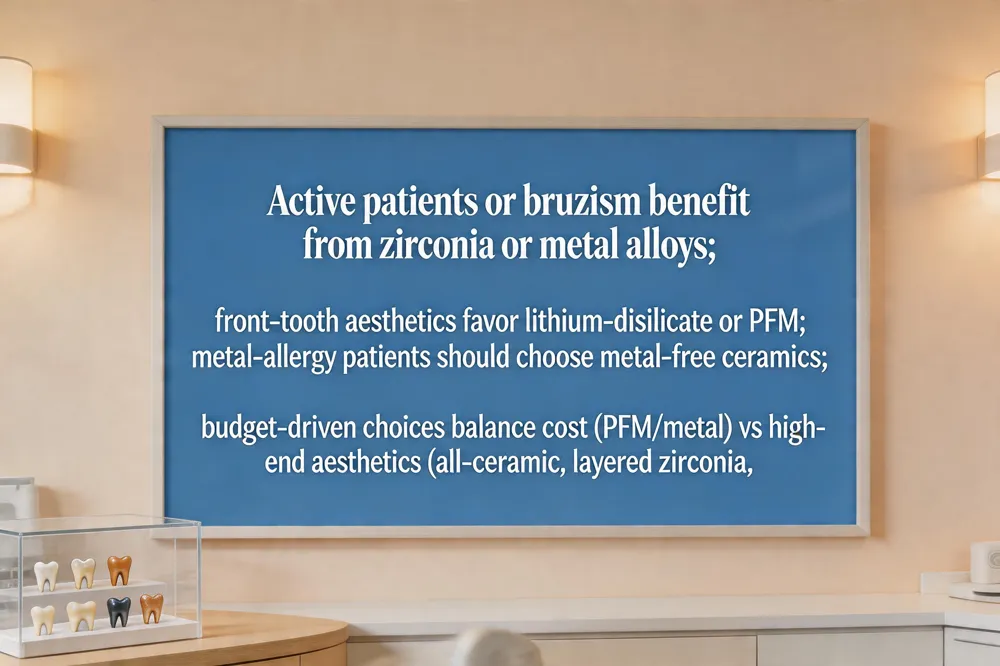 Personalized material selection: Exam lets dentist match crown type to patient’s lifestyle—athletes or grinders often benefit from zirconia or metal; professionals who interact frequently may prefer all‑ceramic or layered zirconia for smile; budget‑conscious patients might choose PFM or metal alloy crowns that balance cost and performance.
