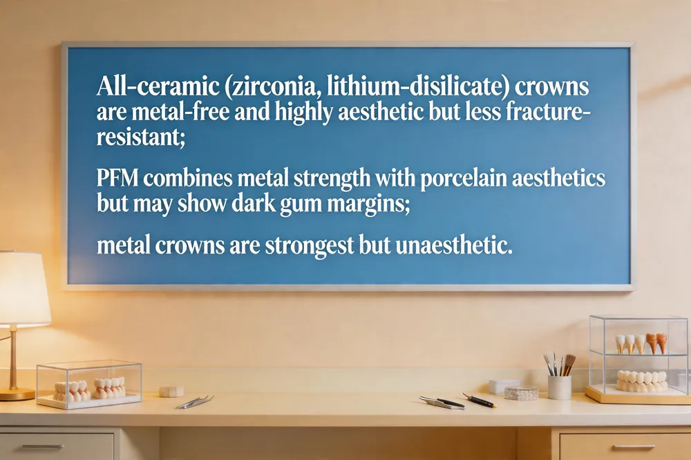 PFM and metal‑alloy crowns offer a cost‑effective balance of durability and decent looks; however, all‑ceramic and layered zirconia crowns, though pricier, deliver superior aesthetics for patients willing to invest. Selecting the right crown material thus aligns material lifestyle, visual goals, allergy concerns, and financial considerations.