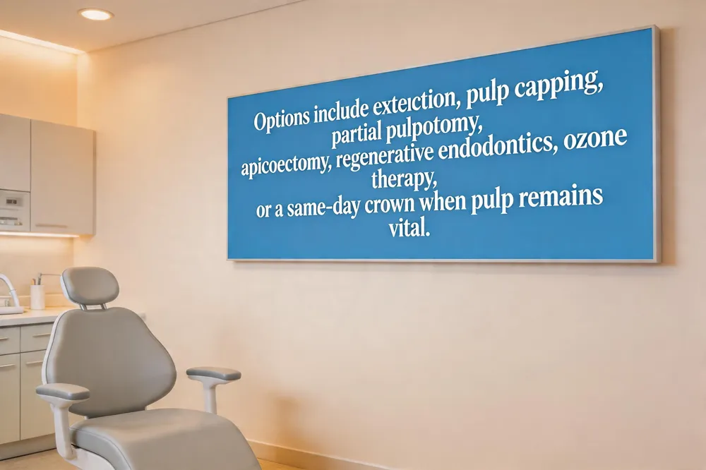 Non‑surgical options – Vital pulp therapy (pulp capping, pulpotomy) can protect a healthy pulp when decay has not reached it. A same‑day all‑ceramic crown, fabricated with CAD/CAM technology, may reinforce a weakened tooth without endodontic work if the pulp remains vital.
