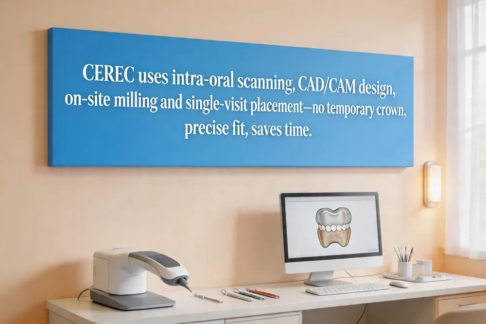 A “Dental Crown in an Hour” is made possible by modern CEREC (Chairside Economical Restoration of Esthetic Ceramics) CEREC technology. The dentist first prepares the tooth, then uses an intra‑oral scanner to capture a digital impression. In the same appointment—typically two hours—the CAD software designs a custom ceramic crown, which is milled on‑site from a high‑strength block of lithium disilicate or zirconia. The permanent, color‑matched crown is then bonded directly, eliminating the need for messy molds, a temporary crown, or a second visit.